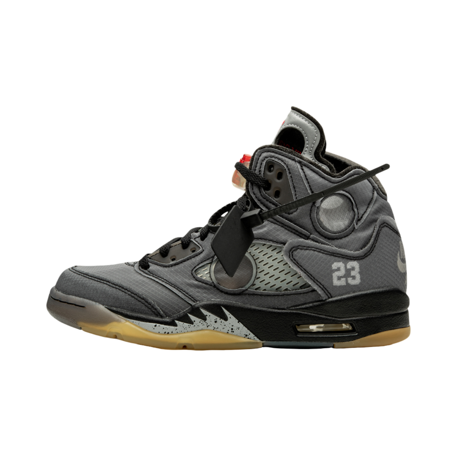 This Jordan 5 is comprised of a black textile mesh upper with translucent netted panels and circular window inserts throughout the shoe. 3M reflective tongues, fire red Jordan branding, and an aged translucent outsole completes the design. These sneakers released in February of 2020 and retailed for $225.